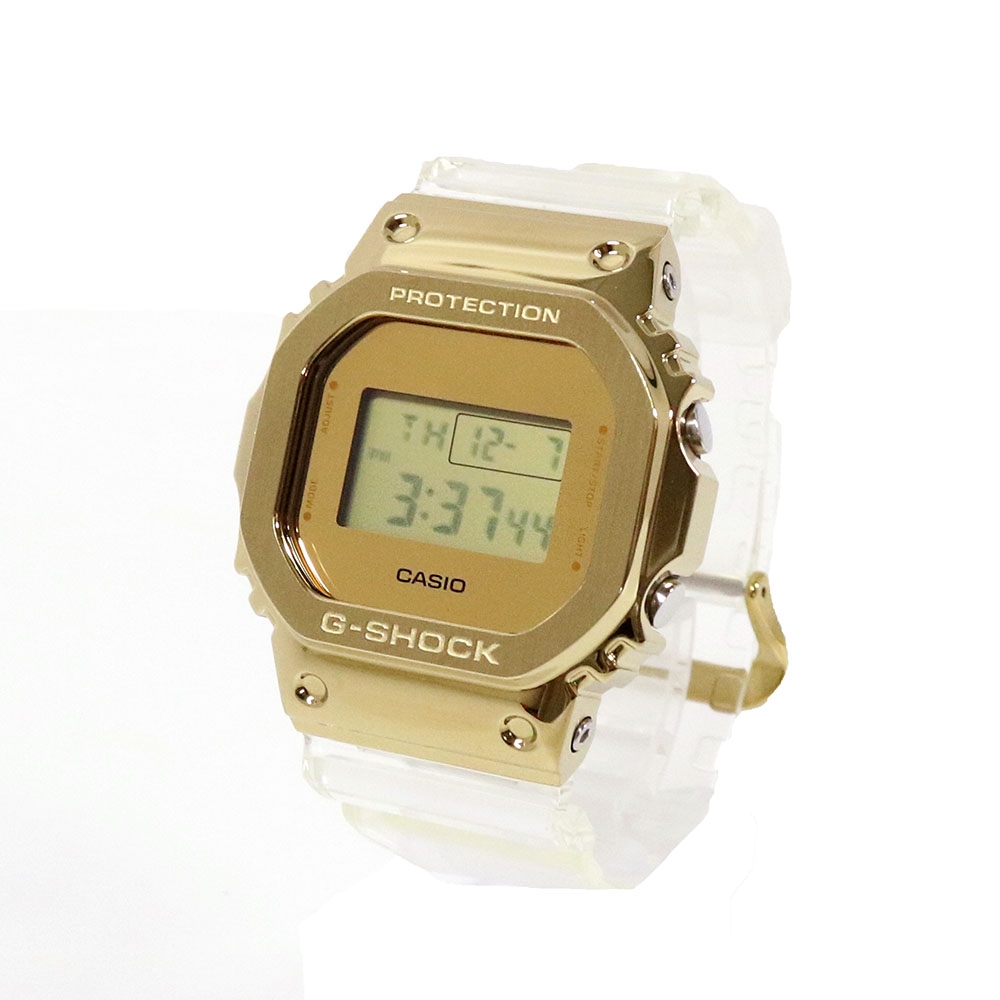 ウォッチ 時計 プレゼント ギフト ゴールド クリア タフネスを追求し進化を続けるG-SHOCKの、ステンレス製ベゼルを採用した硬質かつファッショナブルなMetal Coveredラインから金塊をモチーフにデザインしたシリーズです。 ベースモデルは初代から受け継がれるコンセプトはそのままに、時計としてのクオリティを追求し外装や装着性の進化に磨きをかけたGM-5600を採用。 バンド部は透明のクリア樹脂を採用し時計部のゴールドを引き立たせ、洗練かつファッショナブルなデザインに仕上がりました。 Metal Coveredラインにゴールドカラーが映える高級感溢れるG-SHOCKです。 | ||||||